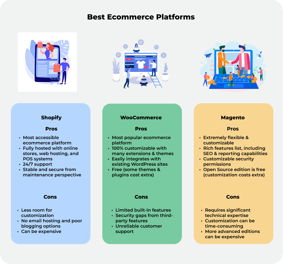 The result is this 2023 comparison guide, where we briefly describe each platform and list the pros and cons we’ve experienced or heard from our customers and partners. We aim to give you a top-level view of the leading ecommerce solutions and help you determine the right fit.